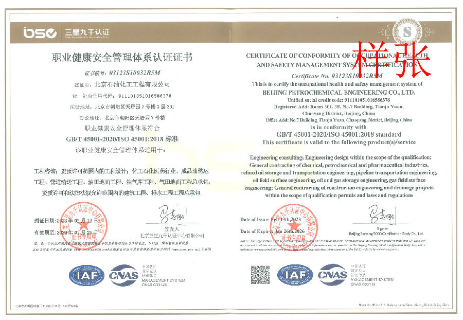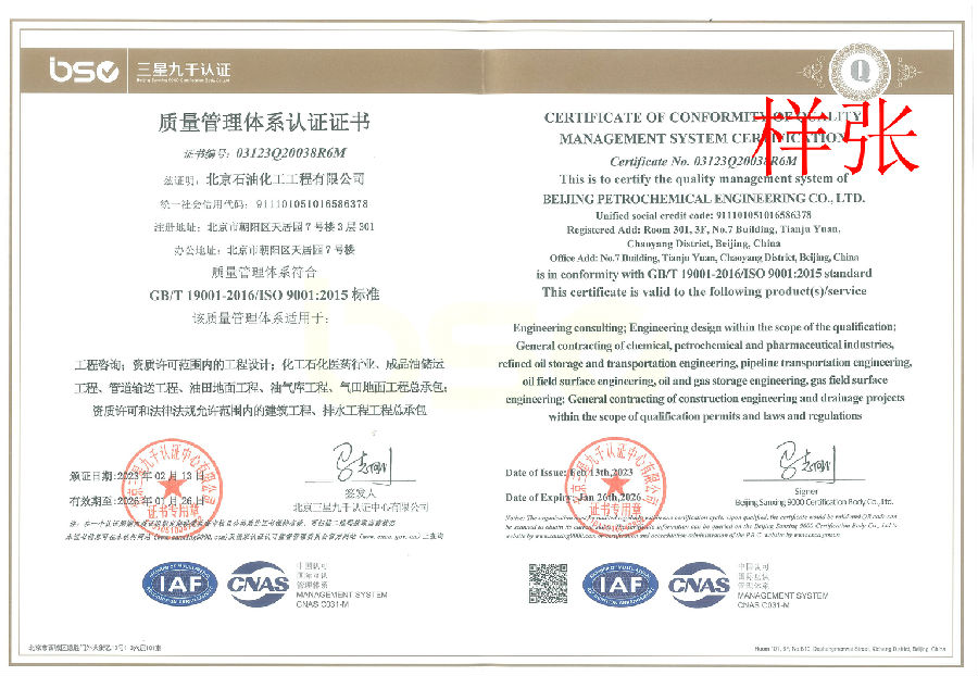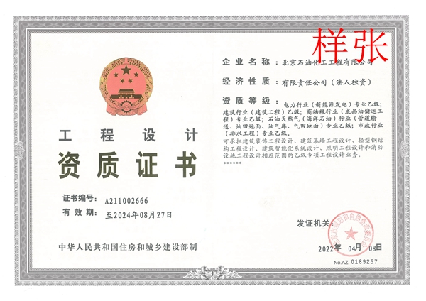 電力行業(yè)(新能源發(fā)電)專業(yè)乙級(jí);建筑行業(yè)(建筑工程)乙級(jí);商務(wù)糧行業(yè)(成品油儲(chǔ)運(yùn)工程)專業(yè)乙級(jí);石油天然氣(海洋石油)行業(yè)(管道輸送、油田地面、油氣庫)專業(yè)乙級(jí);市政行業(yè)(排水工程)專業(yè)乙級(jí)。