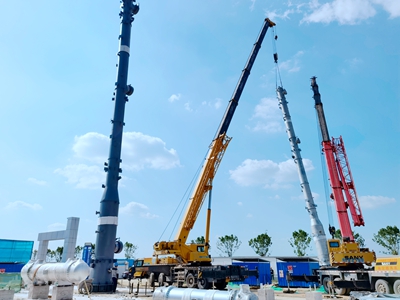 8月20日,從公司咸陽LNG儲氣庫配套20萬m3/d液化天然氣裝置EPC項目傳來捷報,脫酸單元吸收塔和再生塔吊裝就位,設備首吊順利完成,這也標志著該項目進入安裝階段,現場設備安裝全面展開。