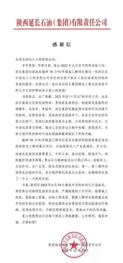 在北京石油化工工程有限公司總承包的延長石油榆神能化50萬噸/年煤基乙醇項目緊鑼密鼓、加快建設(shè)的關(guān)鍵時期,12月29日,陜西延長石油(集團(tuán))有限責(zé)任公司向我公司發(fā)來感謝信,對我公司2021年乙醇項目建設(shè)工作給予了充分肯定和高度評價。