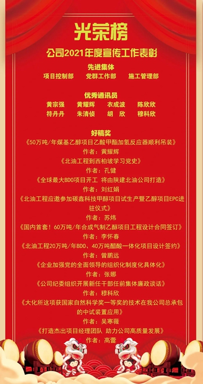 為表彰先進,樹立典型,激發(fā)新聞宣傳隊伍的工作熱情,進一步做好公司信息宣傳工作,近日,北京石油化工工程有限公司對2021年度宣傳工作先進集體和優(yōu)秀個人進行了表彰。