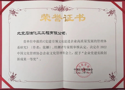 北京石油化工工程有限公司榮獲“黨建強(qiáng)企優(yōu)秀案例一等獎(jiǎng)”。另外,公司黨委申報(bào)的2021年度和2022年度兩篇黨建和企業(yè)文化研究成果獲獎(jiǎng):《黨建引領(lǐng)文化促進(jìn)企業(yè)高質(zhì)量發(fā)展的管理體系研究》榮獲“企業(yè)黨建實(shí)踐創(chuàng)新成果一等獎(jiǎng)”;《國(guó)有企業(yè)加強(qiáng)黨的全面領(lǐng)導(dǎo)的組織化、制度化、具體化》入選“以高質(zhì)量黨建引領(lǐng)企業(yè)高質(zhì)量發(fā)展創(chuàng)新優(yōu)秀成果”,并正式入編由人民日?qǐng)?bào)出版社出版發(fā)行的《以優(yōu)異成績(jī)向黨獻(xiàn)禮——新時(shí)代黨建與企業(yè)文化創(chuàng)新優(yōu)秀成果選編》。