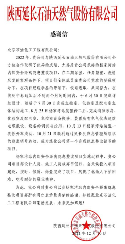 近日,北京石油化工工程有限公司收到來(lái)自陜西延長(zhǎng)石油天然氣股份有限公司的感謝信,對(duì)我公司總承包的楊家灣站內(nèi)部安全距離隱患整改項(xiàng)目在建設(shè)期間精心策劃、合理安排施工、克服不利因素,保質(zhì)保量按期完成了任務(wù)目標(biāo),得到了業(yè)主的肯定。
