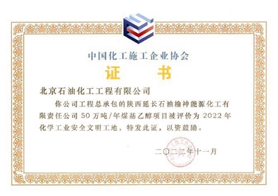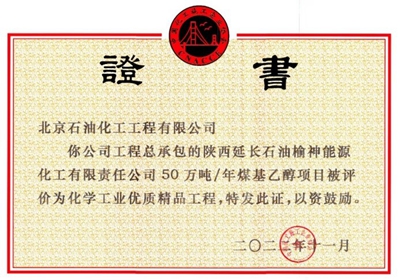 近日,由北京石油化工工程有限公司(簡稱:北油工程)總承包的榆神能化50萬噸/年煤基乙醇項(xiàng)目獲得中國化工施工企業(yè)協(xié)會(huì)頒發(fā)的“2022年度化學(xué)工業(yè)優(yōu)質(zhì)精品工程”、“2022年度化學(xué)工業(yè)安全文明工地”及“2022年度化學(xué)工業(yè)綠色施工工程”等三項(xiàng)殊榮。