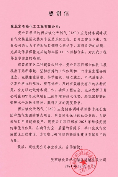 近日,北京石油化工工程有限公司收到來自陜西液化天然氣儲(chǔ)備運(yùn)銷有限公司的感謝信,對我公司在西安液化天然氣(LNG)應(yīng)急儲(chǔ)備調(diào)峰項(xiàng)目(簡稱:西安LNG項(xiàng)目)11.15項(xiàng)目節(jié)點(diǎn)建設(shè)期間全體參建人員不分晝夜,不斷投入機(jī)械和人力,以“向白晝爭分秒,向黑夜要時(shí)間”的拼勁,保質(zhì)保量完成裝卸車區(qū)工程目標(biāo)表示感謝。