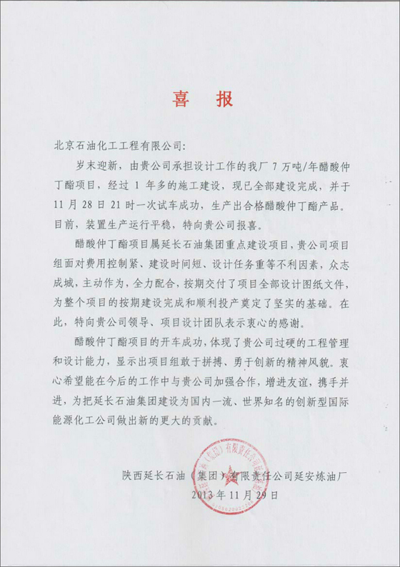 由我公司設(shè)計(jì)的陜西延長石油(集團(tuán))有限責(zé)任公司延安煉油廠7萬噸/年醋酸仲丁酯項(xiàng)目,經(jīng)過近1年的設(shè)計(jì)、采購和施工建設(shè),整個(gè)工程已全部建設(shè)完成,2013年11月28日一次試車成功,生產(chǎn)出合格的醋酸仲丁酯產(chǎn)品,目前各裝置生產(chǎn)運(yùn)行平穩(wěn)。為此,業(yè)主單位特向我公司發(fā)來喜報(bào)。