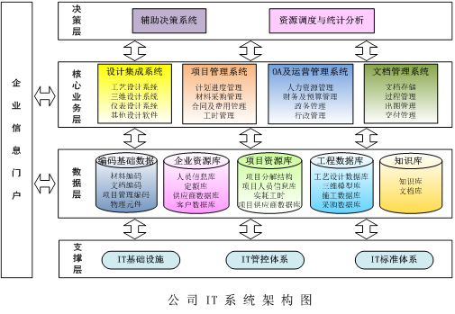 公司建立起以設(shè)計(jì)集成系統(tǒng)、項(xiàng)目管理系統(tǒng)、OA及運(yùn)營管理系統(tǒng)、全面預(yù)算系統(tǒng)和文檔管理系統(tǒng)為主體的核心業(yè)務(wù)層系統(tǒng),對工程設(shè)計(jì)、工程項(xiàng)目管理、公司運(yùn)營管理的日常工作起到支撐作用。